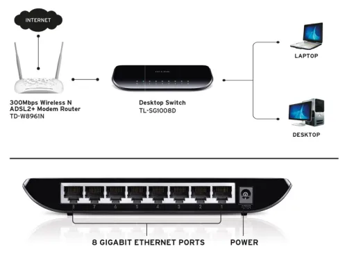 – 8 cổng RJ45 Gigabit Auto-Negotiation, hỗ trợ MDI/MDIX tự động